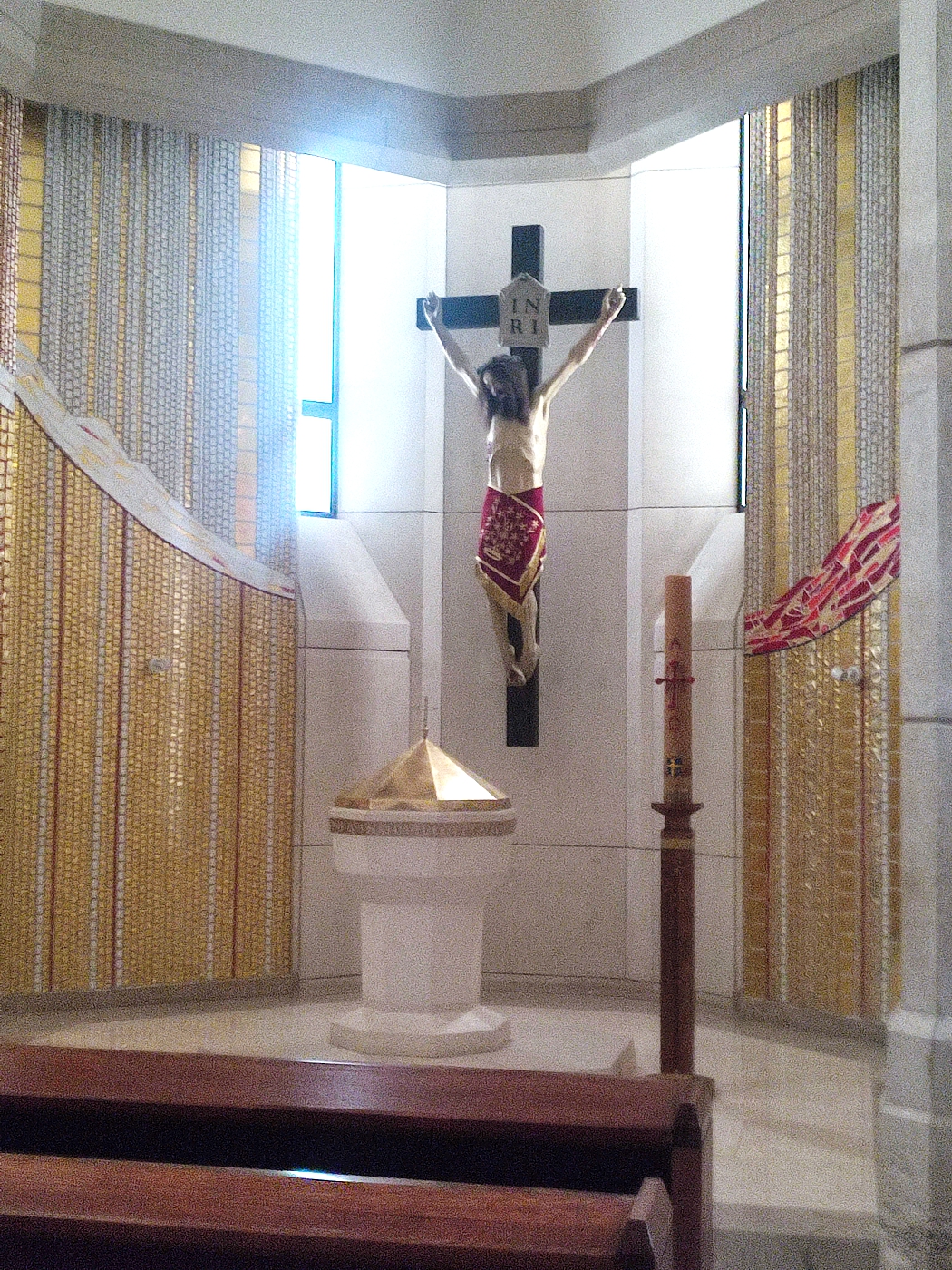 Górna świątynia również ma plan ośmiokąta. Prezbiterium i ściany zdobią mozaiki autorstwa o. Marko Ivana Rupnika SJ. Do kościoła prowadzą trzy brązowe drzwi przedstawiające sceny z życia Jana Pawła II. W bocznej części kościoła znajduje się relikwia w postaci sutanny, którą papież miał na sobie podczas zamachu 13 maja 1981 roku.