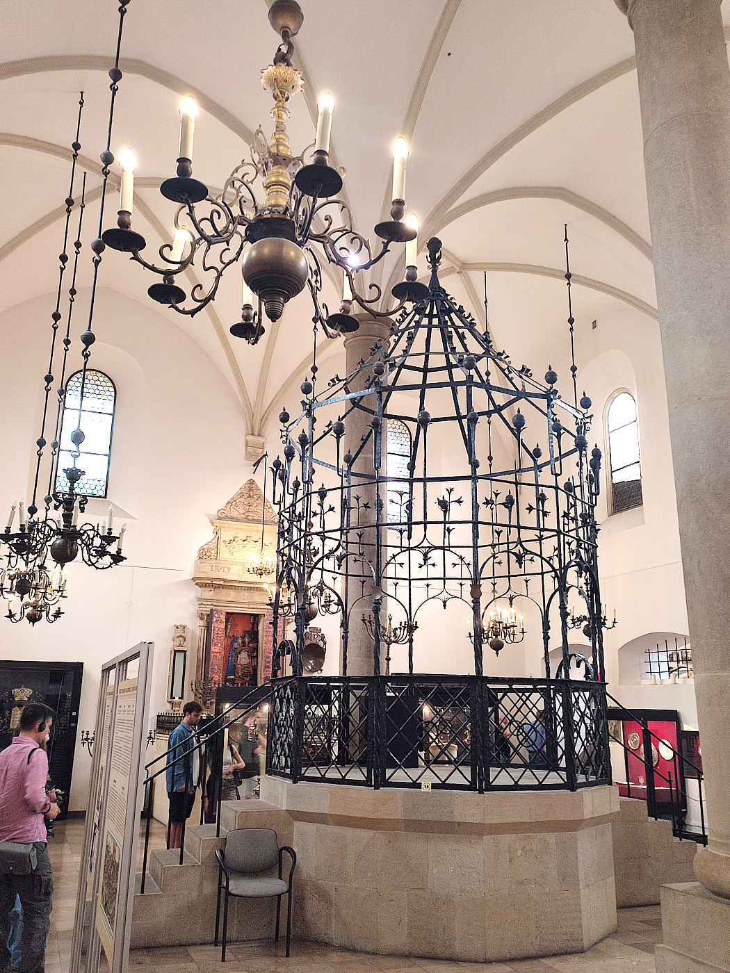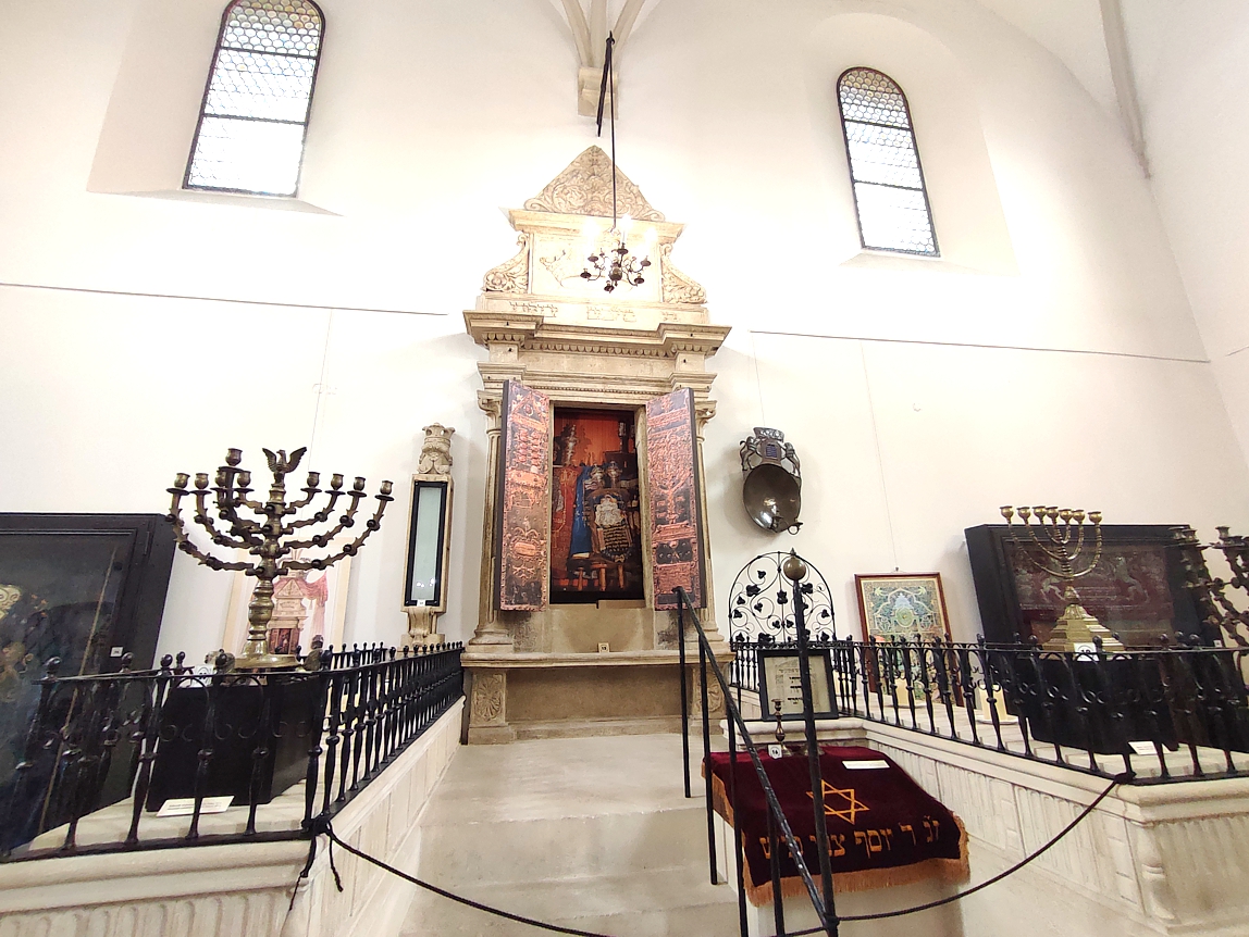 Do wnętrza prowadzi renesansowy portal z hebrajskim napisem „To jest brama Jahwe, sprawiedliwi przez nią wchodzić będą”. W przedsionku znajduje się kamienna studnia do rytualnego obmycia rąk. W centrum sali stoi zrekonstruowana, żelazna bima w formie baldachimu, a przy wschodniej ścianie – późnorenesansowy Aron ha-kodesz z cytatem z Księgi Przysłów.